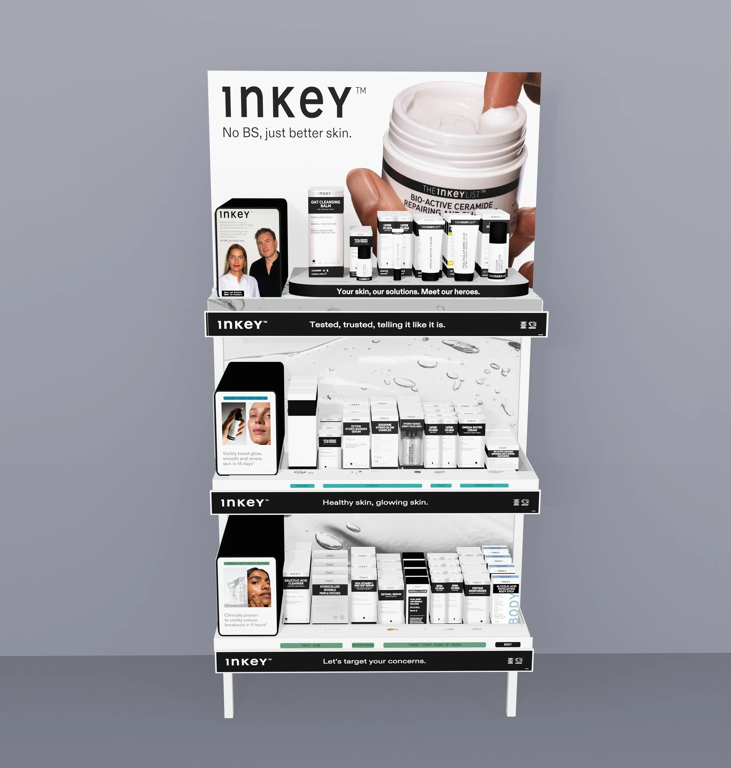 For The INKEY List’s debut at Ulta Beauty, I developed seven unique fixture configurations to suit 1,400+ store formats across the U.S., ensuring each adaptation maintained a strong brand presence while fitting diverse retail environments. I also designed promotional tables to drive brand awareness and create impactful in-store moments, helping to introduce the brand to new customers on a national scale. This project required balancing creative vision with practical retail constraints, resulting in a consistent yet flexible brand identity across all locations.